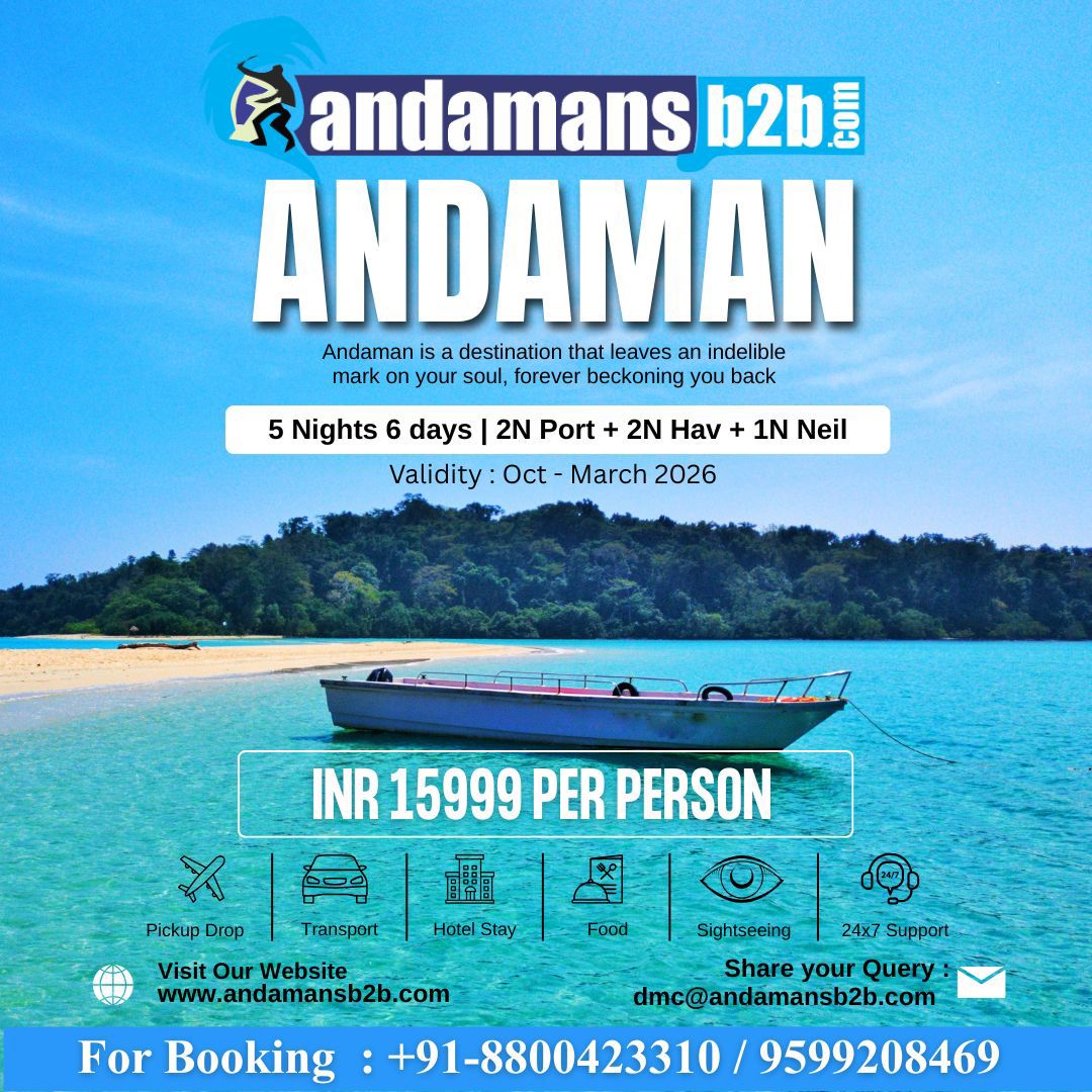 Escape to a tropical paradise with our Beautiful Andaman (5N/6D) promotional holiday package. Explore sun-kissed beaches, crystal-clear waters, and rich marine life that make Andaman a dream destination. From thrilling water sports to serene island hopping, this package offers the perfect blend of adventure and relaxation. Book now for an unforgettable coastal getaway!
